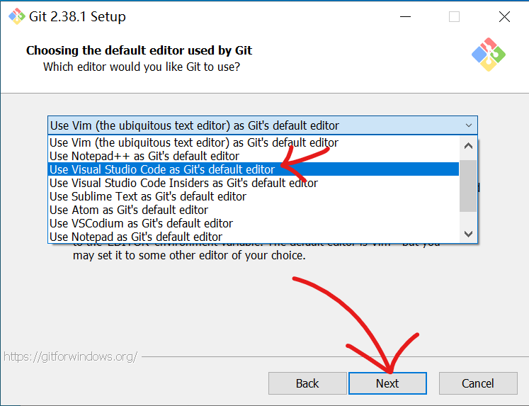 这边是设置Git默认配置文件编辑器,可以自由更改,后期可以通过命令修改