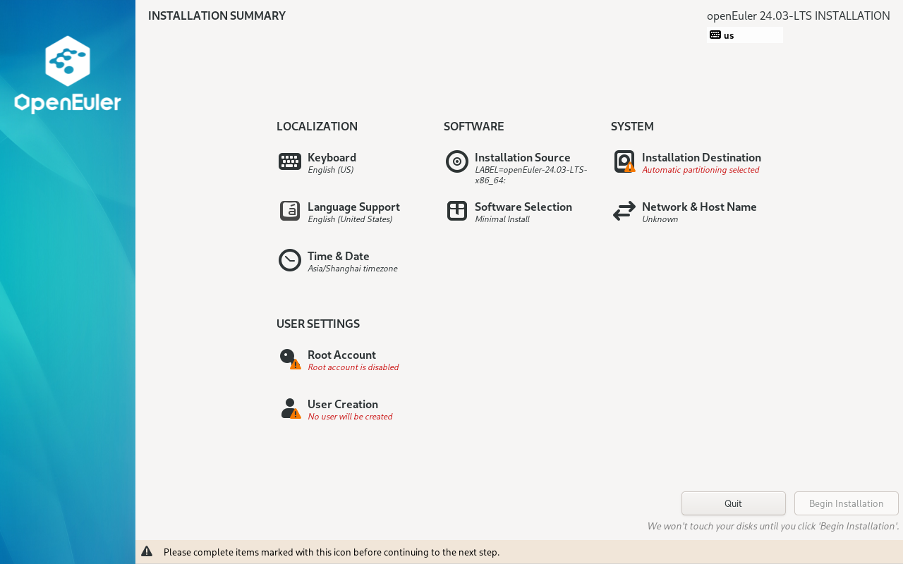 这个是openEuler的安装器主选单,可以选择你的安装位置,预装软件和用户名等设置。所有设置都选择完成后,可以点击右下角的Begin Installation开始安装。等待一段时间后,就可以点击Reboot System重启虚拟机了,会自动引导安装好的系统。