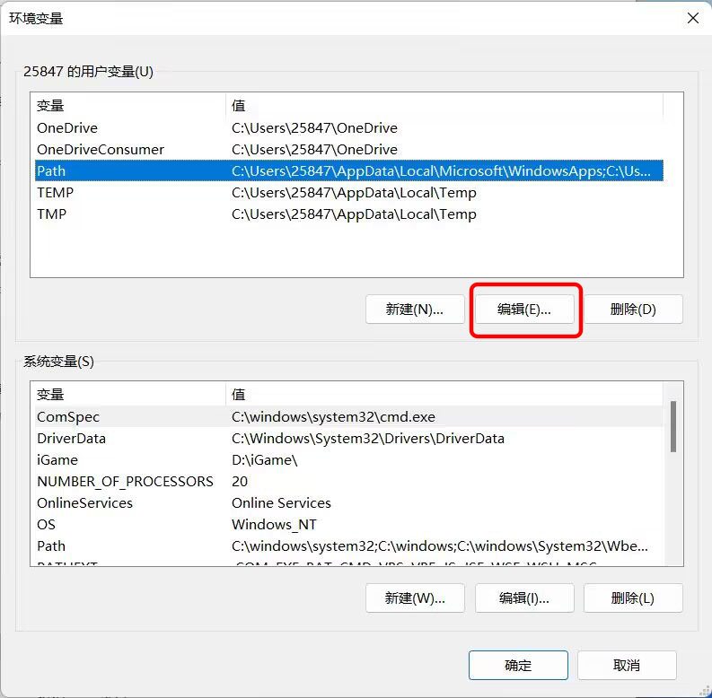 然后双击上面用户的Path条目,也就是图片中蓝色的一行,或者选中这一行以后点击一下编辑按钮