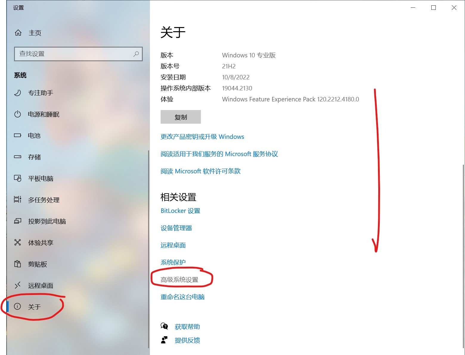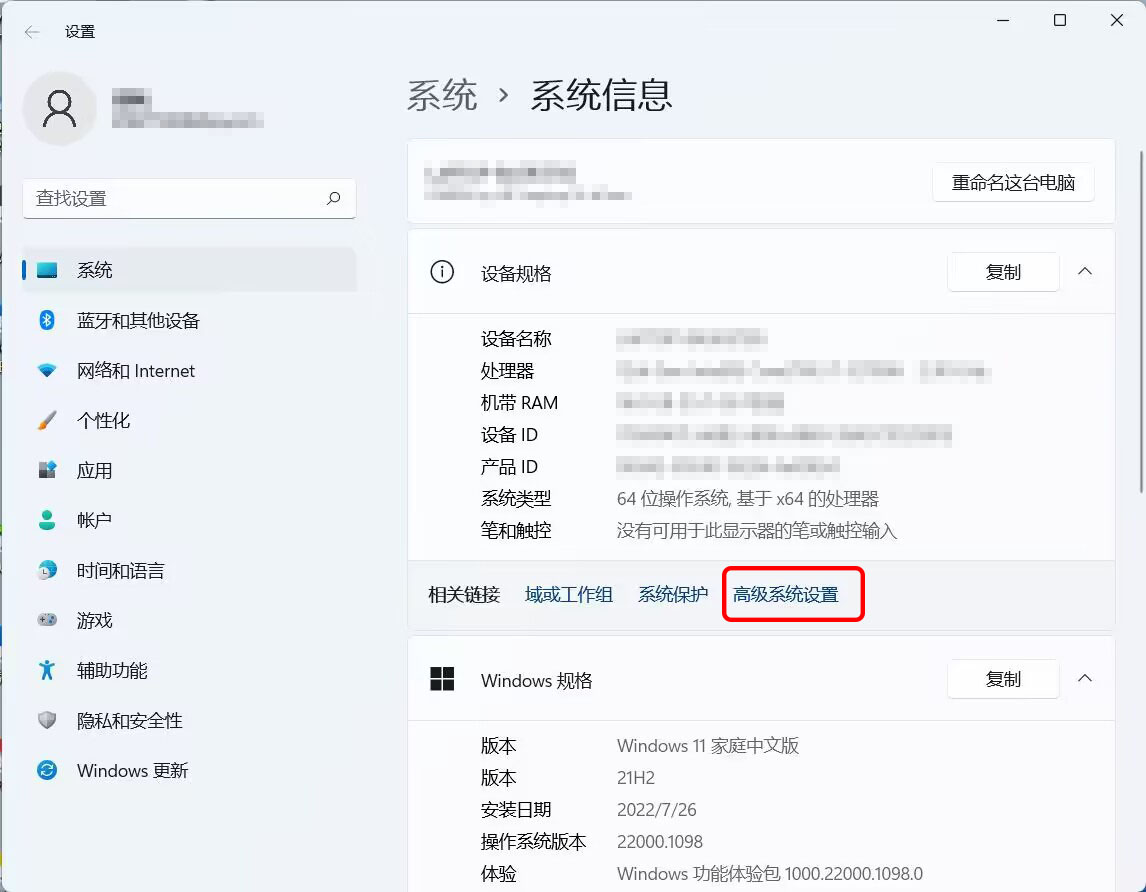 首先找到windows设置->系统->系统信息->高级系统设置选项