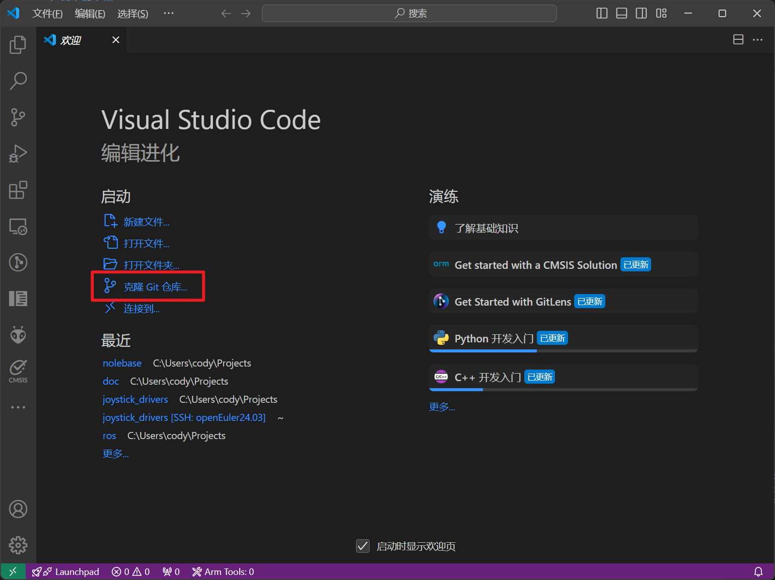 使用VSCode克隆非常简单,首先打开VSCode界面,点击克隆Git仓库...