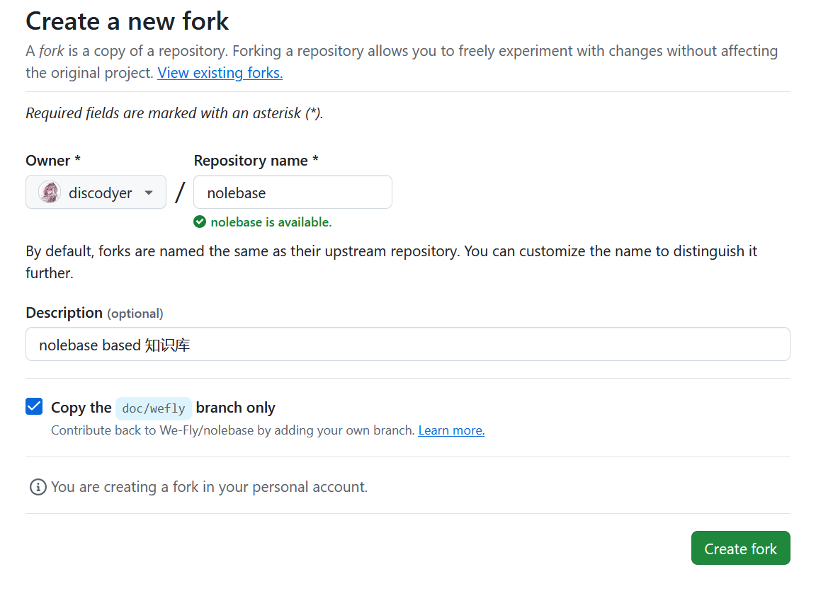 然后fork仓库的note分支,这个分支是发布分支,点击右下角的Create Fork按钮就会在你的用户下创建一个仓库